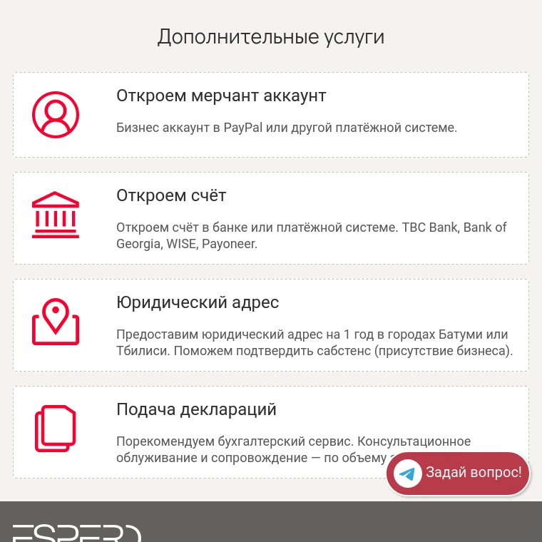 Я хотела бы выразить свою искреннюю благодарность компании Espero за помощь в регистрации моей компании в Грузии. Я была приятно удивлена высоким профессионализмом и вниманием к деталям, проявленным сотрудниками компании.